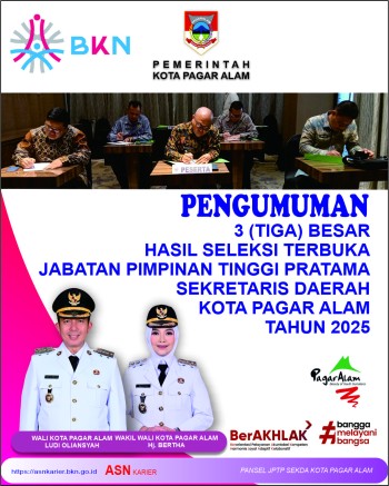 Tahapan kegiatan seleksi terbuka Jabatan Pimpinan Tinggi Pratama Sekretaris Daerah Kota Pagar Alam pada tahun 2025 telah selesai dilaksanakan oleh Tim Pansel. Setelah mendapatkan rekomendasi dari BKN berupa 3 (tiga) nama kandidat, Pemerintah Kota Pagar Alam menetapkan 1 (satu) orang yang dipilih sebagai calon Sekretaris Daerah Kota Pagar Alam.